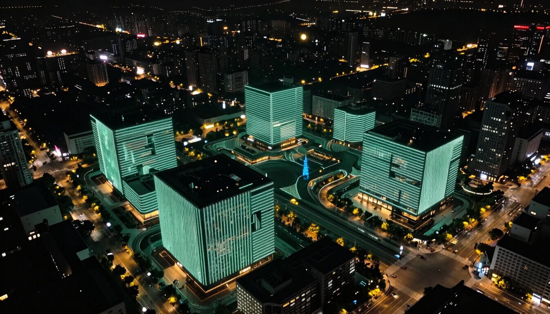 A professional wide shot of a high-tech server room at night, with rows of server racks emitting a soft neon green and cyan glow, creating a futuristic atmosphere, Global / International.